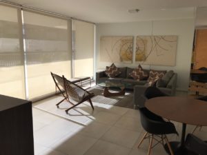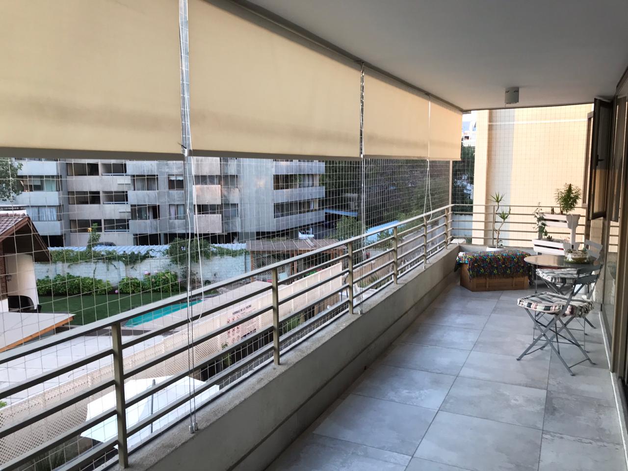 Amplio Living Comedor, gran terraza con malla y cortinas roller.