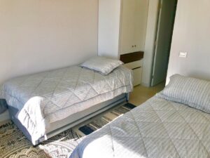 Un dormitorio con cama matrimonial, baño privado y Smart TV. Segundo dormitorio con 2 camas individuales y 1 cama diván (nido) y baño privado.
