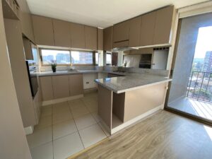 Consta de cocina americana amoblada con cubierta de granito, cocina encimera, horno eléctrico y campana. Living-comedor con acceso a una amplia y cómoda terraza con malla de seguridad, con vista parcial a la cordillera.